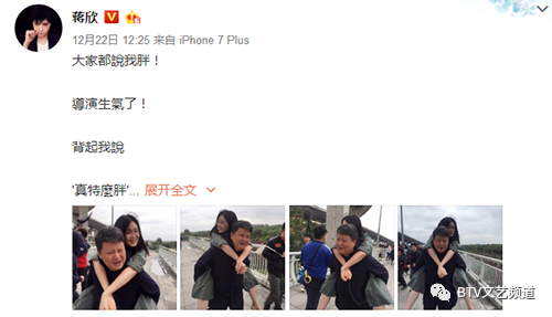 昨日,蒋欣在微博上晒出一组在《欢乐颂》片场的照片,并附文调侃道:“大家都说我胖了!导演生气了!背起我说‘真特么胖’。”