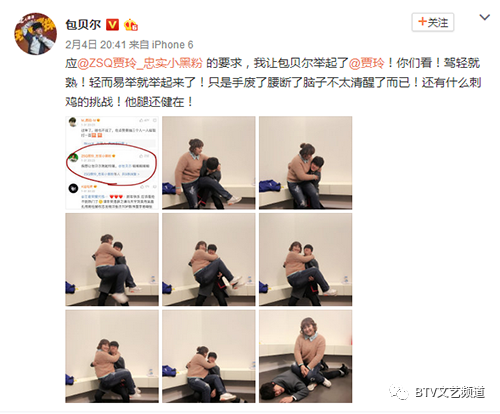 日前,演员包贝尔在微博晒出一组“沉重”的照片,并发文:“应粉丝的要求,我举起了贾玲!你们看!驾轻就熟!轻而易举就举起来了!只是手废了腰断了脑子不太清醒了而已!还有什么刺鸡的挑战!他腿还健在!”