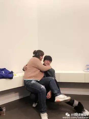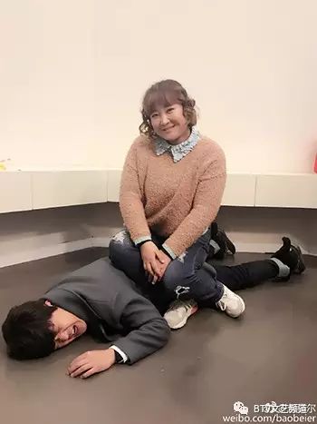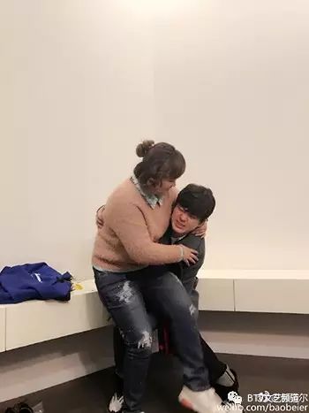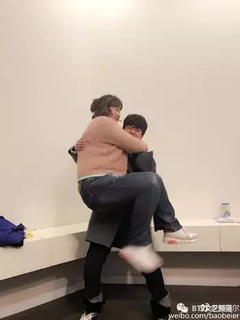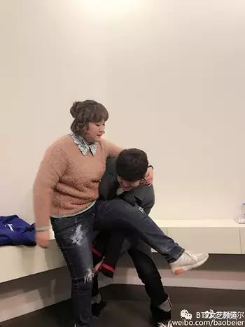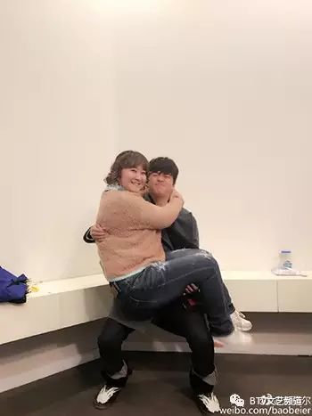 照片中,包贝尔为了满足粉丝要求奋力抱起贾玲。