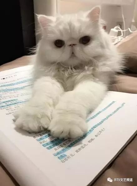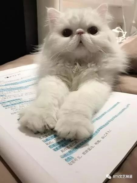 照片中,范冰冰的爱猫小白妹妹挡住冰冰的剧本不让看,一双大大的眼睛十分无辜。