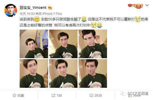 本是引以为傲的蛇精脸干嘛又要融掉呢?原来他之前发微博跟网友放言,点赞破10万就融掉全脸玻尿酸,结果看热闹的吃瓜群众们不嫌事大,马上联手破10万。刘梓晨也依照承诺,然后就变成了这样......