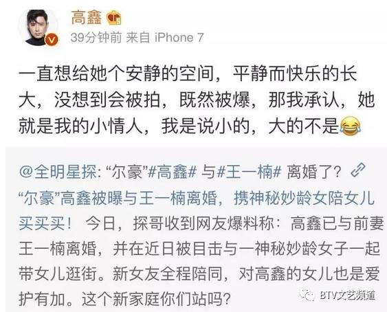 随后高鑫发声称女儿是小情人,另一位女子并非情人。