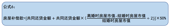 公式5可称为“假设新购分割法”,类似于“总价值分割法”。但与公式1、2、3不同的是,它将结婚时的房屋市值和婚内共同还贷的利息相加作为成本,得出共同还贷金额在此成本中所占比例,再乘以离婚时的房屋市值,作为夫妻间的分割标的。
