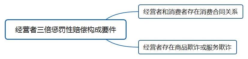 根据《消费者权益保护法》第55条第1款规定,消费者提起经营者三倍惩罚性赔偿的请求权基础是违约,该惩罚性赔偿的构成要件如下:一是经营者和消费者存在消费合同关系,即以书面或口头等形式表现出的各类消费合同;二是经营者存在欺诈行为。