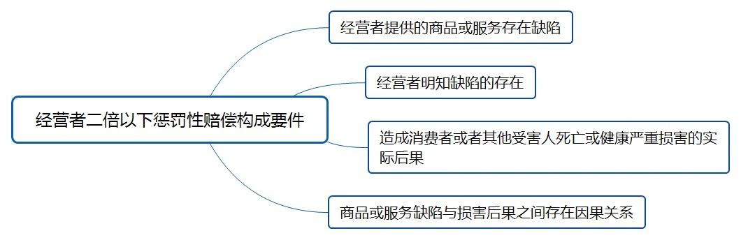 依据《消费者权益保护法》第55条第2款,经营者二倍以下惩罚性赔偿的构成要件如下:一是经营者提供的商品或服务存在缺陷;二是经营者明知缺陷的存在;三是造成消费者或其他受害人死亡或健康严重损害的实际后果;四是商品或服务缺陷与损害后果之间存在因果关系。