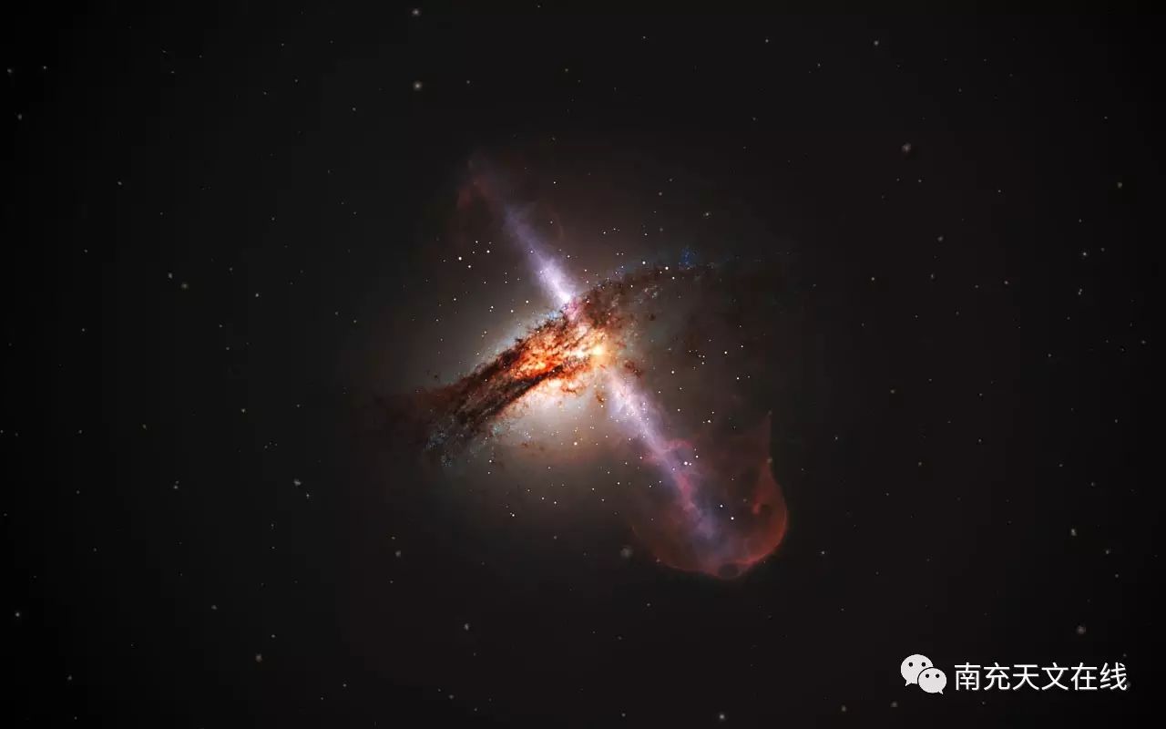电波星系,顾名思义就是在电波波段非常明亮的星系。这种星系的核心通常有着非常活跃且质量高达数百万倍太阳质量的超大质量黑洞(super-massive black hole),因而得以释放大量电波辐射。这是因为气体和尘埃在落入黑洞的过程中,会释放大量的能量。这些能量汇聚成两道粒子喷流,从黑洞的南北两极以接近光速的速度向外飞奔而去。当喷流冲进星系里,两道喷流都会与星系里的气体交互作用,从而各自形成办状结构(lobe)或辐射热点(hot-spot of radiation)。
