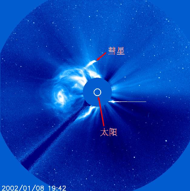 2002年中的彗星96P与太阳(白圈),彗星位于图片中白圈(太阳)上方,图片来自SOHO LASCO C3