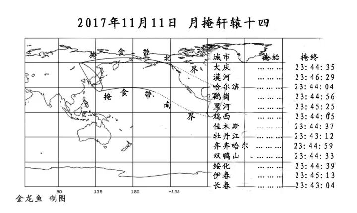 2017年11月11日,月掩轩辕十四掩食带区域图。底图来自Occult。