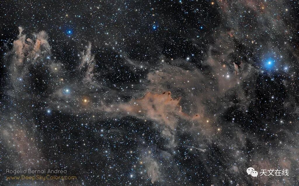 除此之外,在这片视野里,正在反射星光的尘埃星云由左到右,分别有距离约莫在1,000光年左右的LBN762、LBN753及LBN743。以这个估计距离来换算,这大片尘埃的跨幅超过140光年。