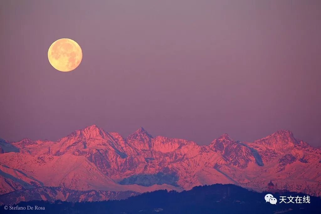 说明: 12月的满月,出现在轨道上离地球最近的近地点附近。同时也带来了清晨时分,大而亮的满月落向意大利.杜林(都灵)崎岖雪山的景观。上面这幅在日出前眺望反向地平线的影像里,地球暗影边缘的散射阳光,把雪峰染上了美丽的晶红。而影像前景的丘陵,则仍然沈浸在暗影里。不过,散射的阳光,恰好照亮了位在这幅长焦镜头影像右下方,座落在丘顶的杜林.古老苏佩尔加大教堂。