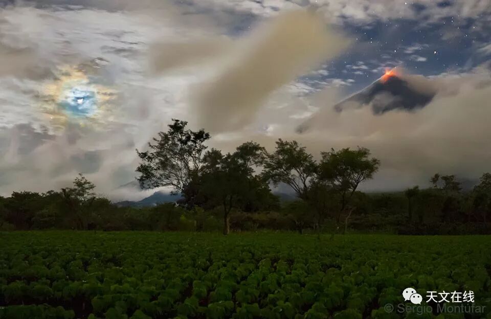 说明: 地平线附近发生了什么事?危地马拉这片菠菜田后方的地平线,除了有许多绿树之外,还有一座名为"火"火山的大型火山。火山顶峰的泛红辉光则是炽热的岩浆。不过,你的眼神可能也会受到左侧地平线上方的泛蓝光环吸引。这个绕拱月亮的多色光环称为"华"。"华"是一种光受到绕射时所产生的现象,在此例中,是月光受到地球大气中的小水之绕射所产生的月华。在影像右侧的云隙里,可见到位在火山后方远处的恒星和土星。虽然火火山经常发生低度的活动,但这位天文摄影者