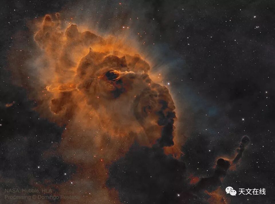 666)。这个结构体位在我们银河系最大恒星形成区船底座星云之内,在南天7,500光年远处绽放辉光。这道尘埃柱的分层轮廓,是受到船底座众多的炽热年轻大质量恒星的恒星风和辐射之塑形,而这批恒星中有部分正形成于星云内。能透视尘埃的红外光观测清楚显示,有二道狭窄的强烈喷流,从一颗仍然隐藏的恒星喷出。
