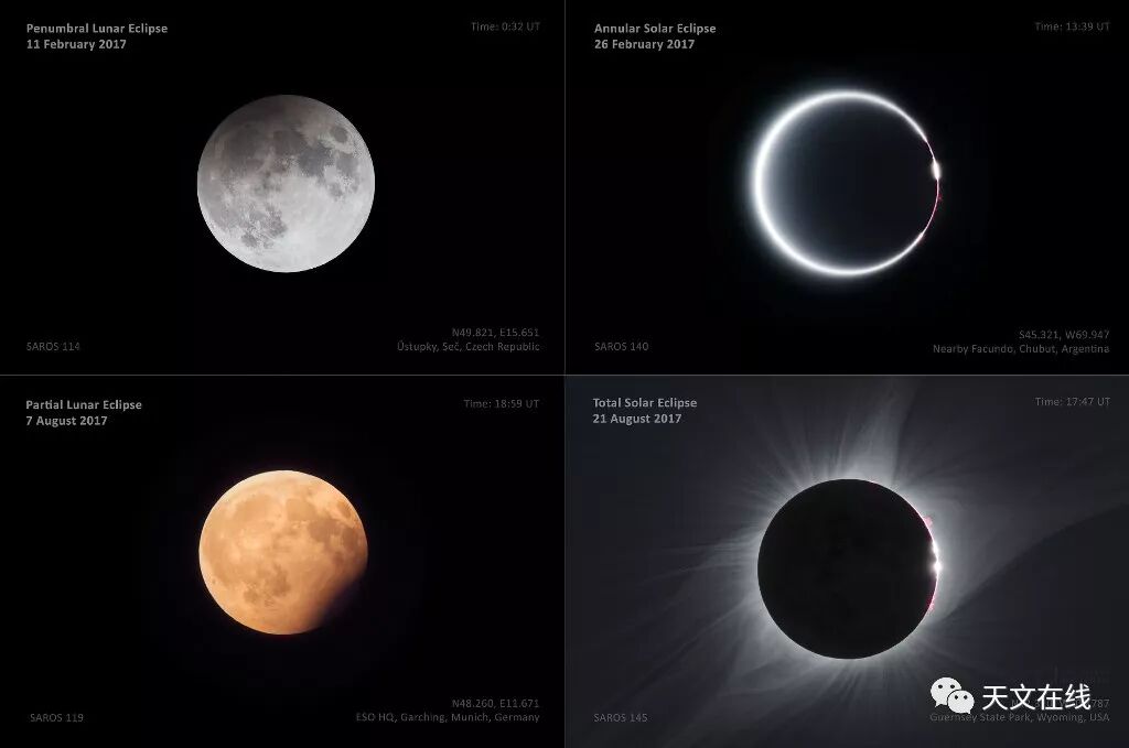 说明: 上面这张四格影像,以相同的尺标呈现2017年在地球见到的所有日食和月食。这些今年的天体光影秀,是由一位酷爱冒险的食象猎人在四个不同的国家拍摄的。今年交食季节的起点,是上左方在捷克共和国拍摄的满月景观;月盘上不明显的影子,是由地球淡淡的外围半影所造成的。在同一个月的月底,右上方影格里镶著火之环的新月,则是撷取自摄于阿根廷令人赞叹日环食中点附近的影片。下方所呈现的8月食象对里,左侧的是摄于德国,由地球黝黑本影造成月偏食,以及右侧在美国西部见到的明亮日冕环拱全食日的景观。如果你有在做记录的话,2017年所有日月食影像的左下角,都标记了该次食象的沙罗周期编号。