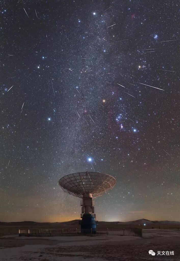 Phaethon(法厄同)释出的尘埃时,所形成的年度双子座流星雨通常很精采。而这幅捕捉到多颗流星从双子座的辐射点射出之北半球影像,即可作为见证。为制作上面这幅影像,总共组合了摄于12月12/13日晚上,超过8.5小时期间的37张照片。在最后的组合阶段时,特选的照片再和离中国.北京约400公里的内蒙古明安图观测基地,明安图超宽带谱射电日像仪(MUSER)一座天线碟上方的星空对齐。在影像中,可见到紧邻天线碟上方的明亮天狼星及绵延向天顶伸展的银河。在北天银河的右方,最醒目的天体是猎户座内泛黄的参宿四。这群流星雨位在左上角的辐射点,则是在北河二与北河三这两颗高悬在地平线上空的双子亮星附近。此外,看似会聚在远方的流星痕,其辐散效应是源自透视。双子座流星在地球大气里的运动速率大约是每秒22公里。