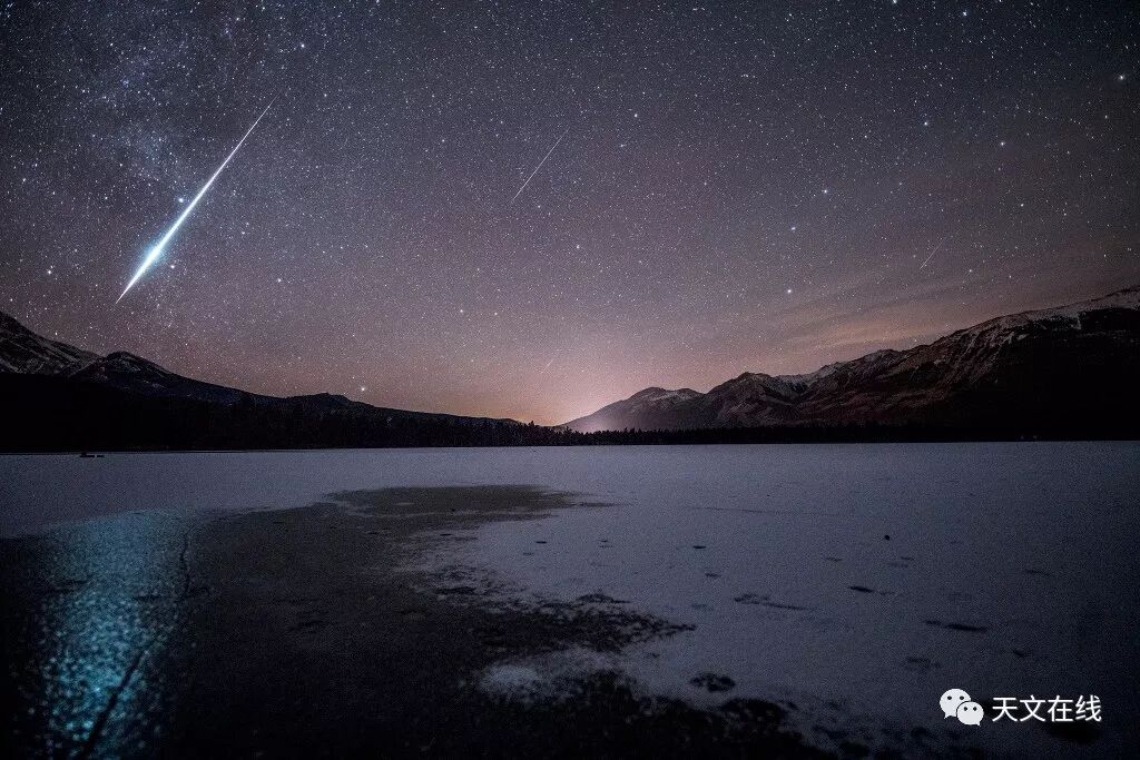 说明: 在这张冬天的夜晚星空影像里,有4颗双子座流星掠过北半球的天空。上面这颗火流星和3颗较暗的流星,是在12月的双子座流星雨极大期时,由这幅10秒长曝光影像所记录。影像的前景是加拿大亚伯达省杰士伯国家公园内,正在反射火流星泛绿辉光的半结冻伊迪斯湖,而绵延横亘在北方地平线的,则是加拿大的洛矶山脉。想当然耳,这座冰河湖泊的湖水就连在夏天也很冰冷。摄影者Jack