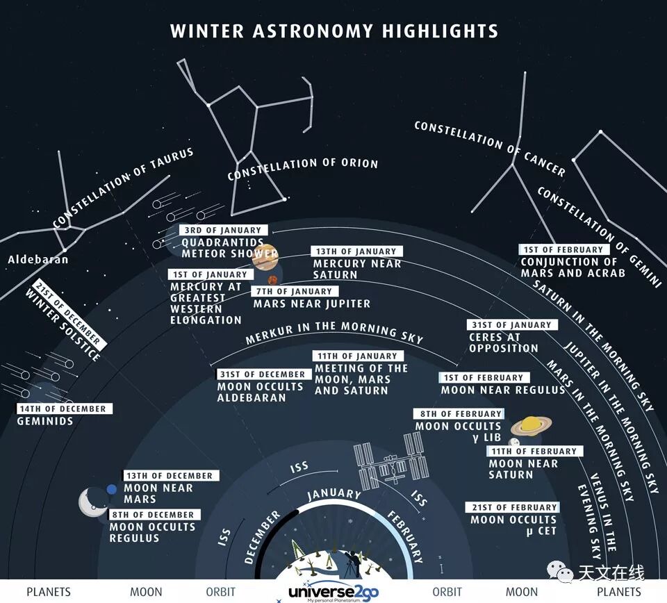说明: 这个冬天的天空有什么呢?这张主题图示,呈现了地球北半球天空的一些精采天象。在下方以钟面为中心的图片里,初冬的事件排在左侧,晚冬的事件则散布在右侧。相对接近地球的事件,通常画在较靠近下缘中心,使用望远镜观测的卡通人物附近;然而,不用动到望远镜,用肉眼即可见到图示里大部分的事件。这个冬季天空的精采天象有:这星期达到极大期的双子座流星雨、夜空中愈来愈容易辨认的猎户座、以及1月份日出前得见的数颗行星。而在任何季节里,有时可以见到国际太空站 (ISS)