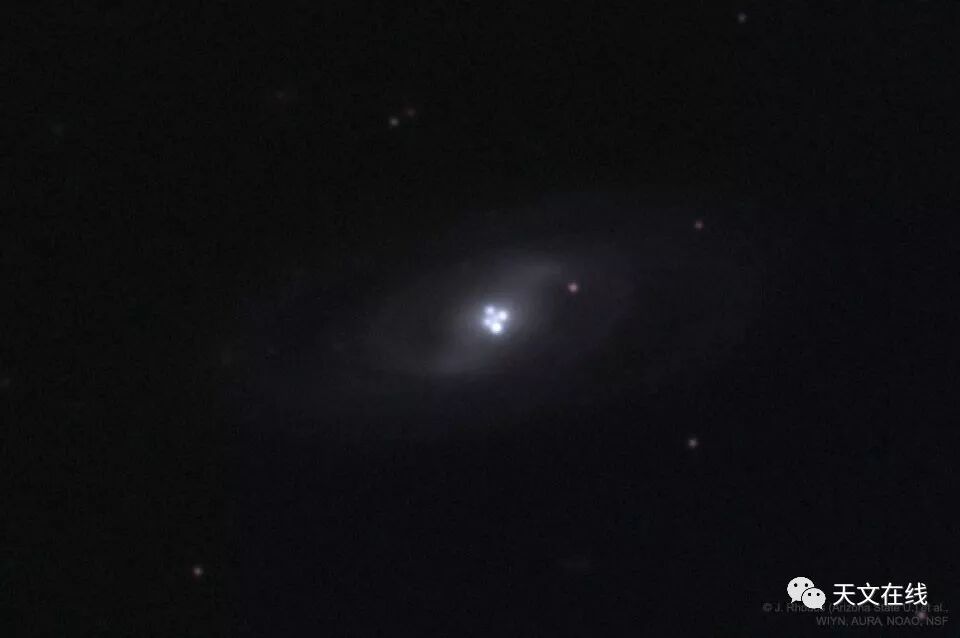 由于这种答案实在太怪异了,让天文学家断言,在这张影像里,根本就看不见这个星系的核心。影像中心的苜蓿叶形天体,实际上是因为前景星系的强大重力场,才把遥远类星体的光,分裂成四个单独的影像。要出现这种类似海市蜃楼的现象,类星体要恰好排列在大质量星系核心的正后方。