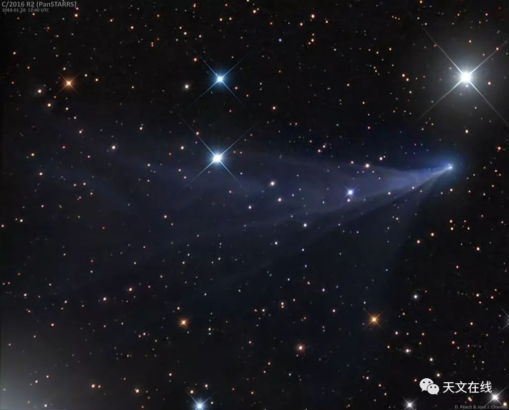 说明: 由泛星望远镜在2016年9月7日发现的泛星彗星C/2016 R2,目前大约距离太阳24光分(3