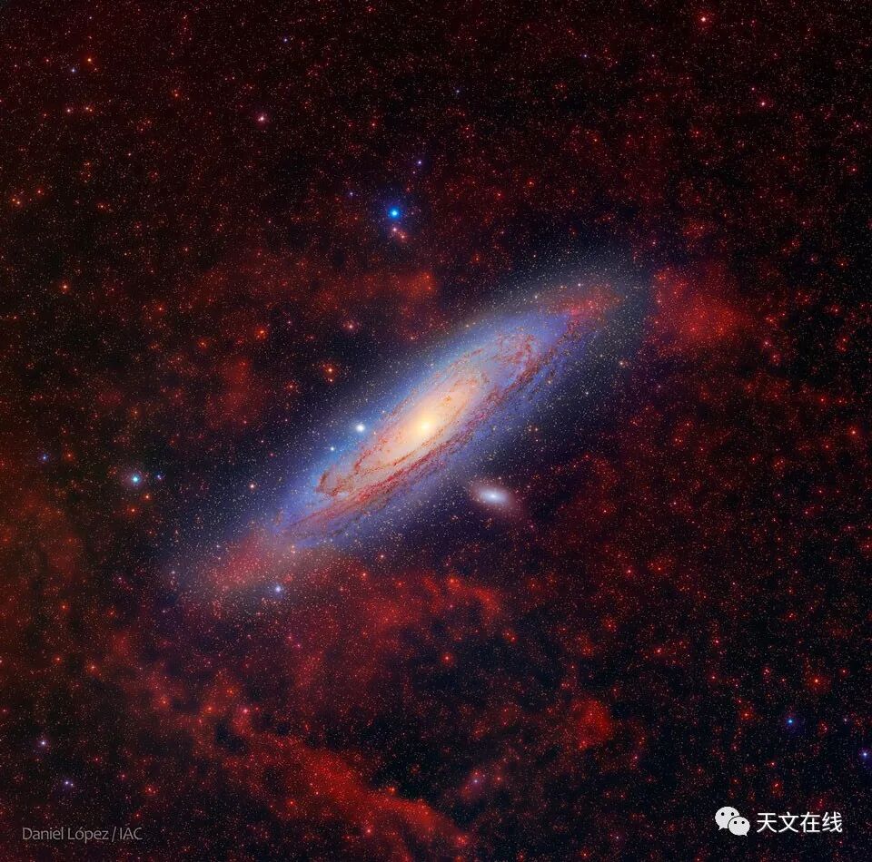 说明: 仙女座大星系周围的这些泛红云气是什么?上图中的星系M31,是地球天文学家经常拍摄的标的。作为最邻近我们的大螺旋星系,它的黝黑尘埃带、明亮泛黄的核心和散布着明亮泛蓝星团的螺旋臂,都是我们很熟悉的景观。然而,在这幅由宽及窄波段长曝光影像数据组合成的彩色照片里,我们邻近的宇宙岛却带着我们并不熟悉的醒目特征──在影像视野里,散布著会发出暗淡泛红辉光的电离氢云。不过这些电离氢气云,很确定是位在影像的前景,近在我们的银河系之内。在我们银河盘面上方数百光年处,分布著弥漫的星际尘埃卷云,而这些电离气体可能就和它有关联。