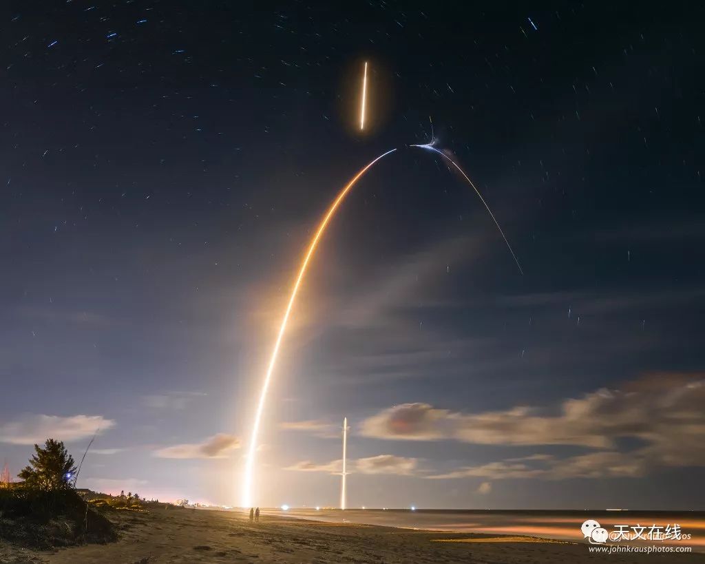 说明: 这幅由三张照片组合成成的夜空影像,呈现1月7日一部猎鹰9号火箭,从地球的太空海岸发射及第一级火箭降落的景观。从卡纳维尔角空军基地发射之后,曳着明亮迹线的火箭从左侧出发,划出了发射升空的初段轨迹。弧线顶端附近的向上钩痕,标示了第一级火箭点燃"回程推进",也钩勒出回程迹线的起点。在此同时,分离后的第二级继续向轨道推进。火箭发射弧上方的明亮光痕,则是透视效应下所见的第一级返回减速,并向卡纳维尔角降落的景象。影像中央下方地平线附近的光痕,则是发射后8分钟左右,第一级火箭进行17秒减速推进,最后成功垂直降落在第一降落区。在照片的长曝光期间,随着地球自转,背景恒星在夜空中曳出短短的迹线。