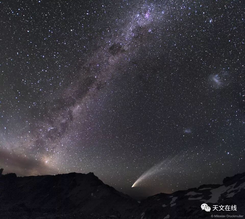 说明: 在这幅壮丽的夜空影像里,散布在南天银河里的弥漫星光和暗星云,悬在地平线上方,斜贯过这片壮丽的夜空景像。这幅动人拼接影像的张角宽达100度,前景则是位在阿根廷.巴塔哥尼亚的崎岖地貌。除了呈现我们身为银河系圈内人所见的光景之外,影像也记录了我们作为圈外人所看到的大和小麦哲伦星系,这二个银河系不规则伴星系的身影。此外,影像也捕捉带着宽广彗尾和明亮彗发的2007年大彗星──麦克诺彗星。