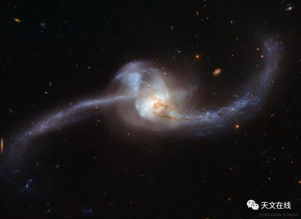 2623所拍摄的影像,显示这两个原先分离的螺旋星系,如今紧密缠绕,而且两者的核心已合并成一个活跃星系核(AGN)。在上面这张主题影像的中心区及二侧清楚可见向外伸展的潮汐尾,恒星诞生活动正在进行中,但是更令人惊讶的是,在左上方远离核心的区域,却出现成群的明亮泛蓝恒星。星系碰撞历时数亿年,而且得经历数个破坏性的重力穿越。亦名为Arp