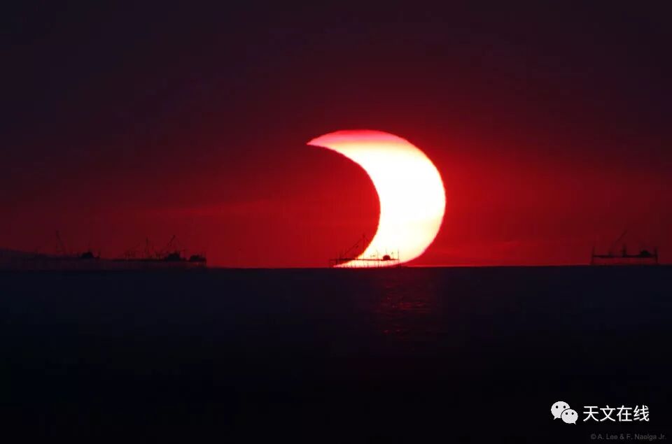 说明: 落日怎么啦?遇到了日食。在2009年初,非洲、澳洲和亚洲部份地区,能看到月亮遮掩部份日盘的日偏食。在上面这幅摄于菲律宾.亚洲购物城海堤的主题影像里,带食的落日悬在菲律宾.马尼拉湾的上方,而前景可见到码头的黝黑剪影。在那年唯一的日环食期间,追日食者和所在位置恰好的天文爱好者,以电影、树影内的食日阵列及火之环等形式,呈现了从有趣到深具艺术性的日食影像。在星期二,部份太阳又会再次受到月亮的遮掩,出现日偏食的景观。不过星期二的日食,只有南美洲南部的部分区域及南极洲才得见。