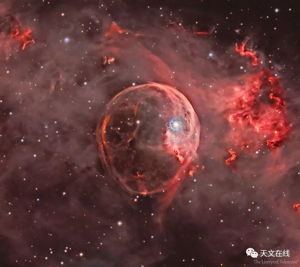 602522的恒星风扩展出来的。它的右侧附近座落着一团泛红的巨分子云。在太空中的这个地点,无可抵挡的力和无法移动的天体,发生了很趣的对撞。这团云气虽然能抵挡气泡的扩张,但也受到气泡中心星炽热辐射的炙烤。这些辐射加热了这团分子云致密的区域,让它们发出辉光。这幅影像里的气泡星云,宽度约有10光年,本身是一个远更庞大的恒星复合体和壳层结构的一部分。气泡星云位在北天的仙后座(埃塞俄比亚皇后)方向,用小口径望远镜就得见。