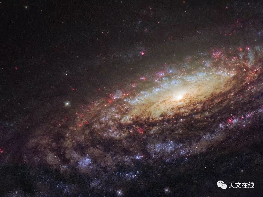 7331,很早就被归类为螺旋星云,而且是18世纪著名梅西叶星表未收录的较明亮星系之一。因为在我们视线方向,这个星系斜对着我们,因此在望远镜长曝光影像里,通常具有很鲜明的层次感。在这幅哈伯太空望远镜拍摄的特写影像里,这个星系壮丽的螺旋臂上,有不透光的黝黑尘埃带、大质量恒星聚成的泛蓝明亮星团和发出特征泛红辉光的活跃恒星形成区。螺旋星系NGC