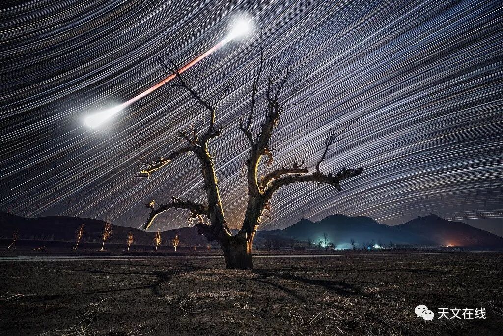 说明: 出现在1月31日,广为地球夜面住民所共赏的节奏轻缓月食,是连续3个月全食的第一例。上面这幅精采的组合缩时影像,建构自固定在三脚架上的相机,摄于中国河北省的一系列照片,用以呈现满月滑过清朗夜空中,历时超过3小时的月食事件之进展。除了月食之前及之后,月亮过于明亮而难以呈现外,在领结状的月亮迹线里,较窄且较暗的泛红区域,是历时1小时16分的月全食阶段。在后方的背景里,可见到天球赤道上方及下方,同心圆弧状的恒星迹线。