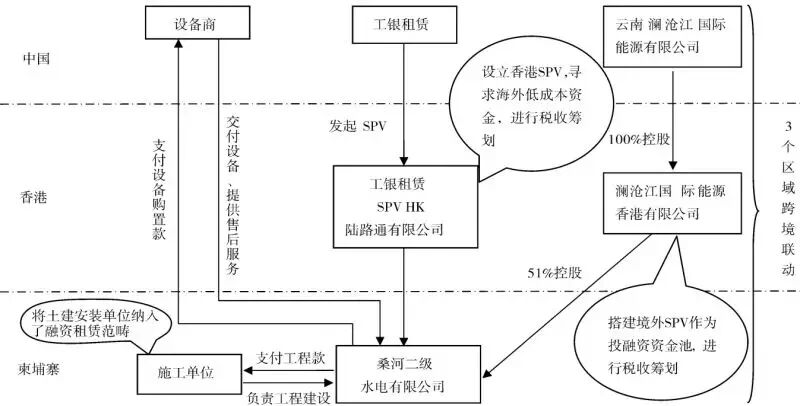 国际能源公司在充分研究论证税收筹划、境外融资、海外资金池、境外再投资、投资退出等各方面的因素后,搭建香港、开曼两层境外SPV公司,由开曼公司直接持股柬埔寨桑河二级项目公司,并由项目公司直接向工银租赁的香港SPV公司进行提款。形成中国、香港、柬埔寨3层跨境联动的融资租赁架构。