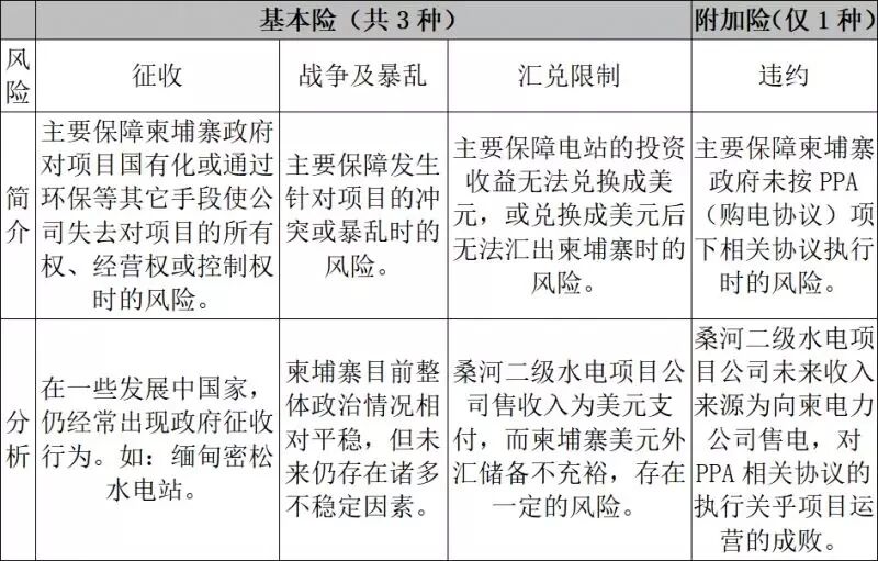 经过与桑河二级水电项目公司其他两家股东的谈判和协商,为保证项目公司的利益,为项目公司的融资提供增信措施,吸取缅甸密松水电站由于政府违约导致项目关停,从而给中方投资者带来惨痛损失的经验,国际能源公司最终为桑河二级水电项目购买了海外投资险项下所涵盖的全部风险。海外投资保险的购买,极大地增强了租赁公司提供融资租赁的信心,为该项目资金的及时到位起到了良好的促进作用。