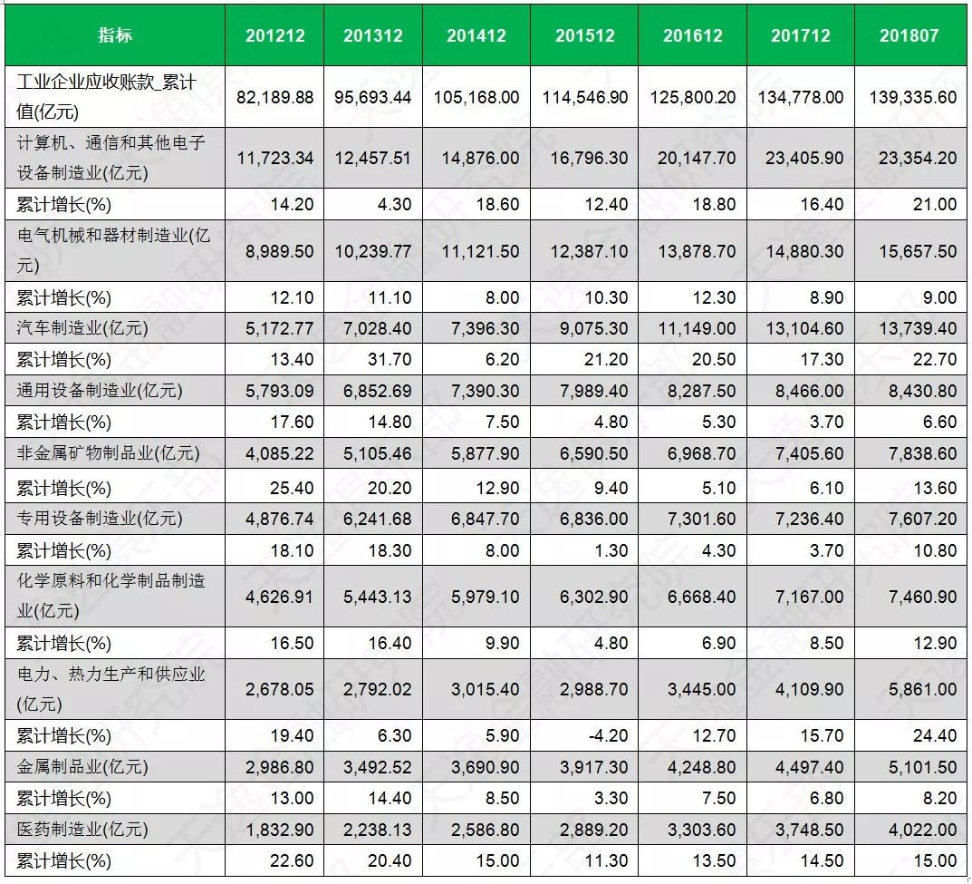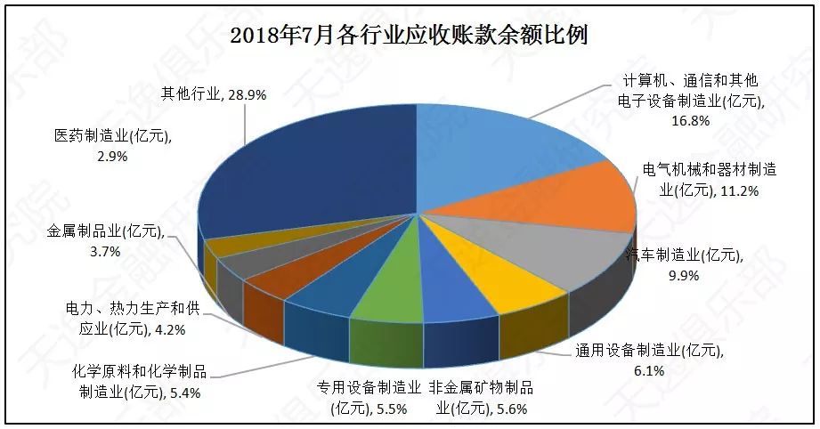 截止2018年7月,全国规模以上工业类企业的应收账款中居前十位的包括这些行业,计算机、通信和其他电子设备制造业、电气机械和器材制造业、汽车制造业、通用设备制造业、非金属矿物制品业、专用设备制造业、化学原料和化学制品制造业、电力、热力生产和供应业、金属制品业、医药制造业。
