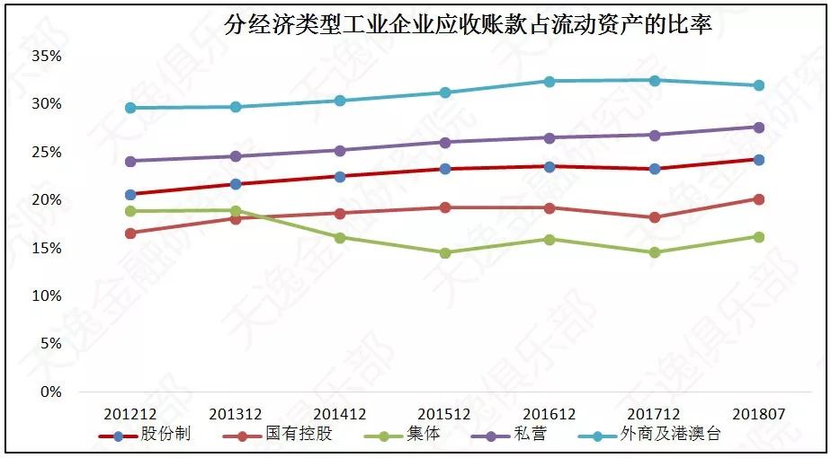 从当前可获得的数据来看,应收账款余额占流动资产的比率近年来一直呈缓慢上升的趋势,其中外商及港澳台的工业企业应收账款余额占流动资产的比率一直比较高,2017年底达到32.5%的高点,截止2018年7月这个比率有所下降,为32%。其次可以看出,私营工业企业的应收账款余额占流动资产的比率也一直较高,并呈缓慢的上升的态势。从下图可以看出,股份制工业企业、国有控股工业企业、私营工业企业和外商及港澳台工业企业的流动资产风险在逐年增加,需要有效地进行应收账款的管理和流动性风险的控制。