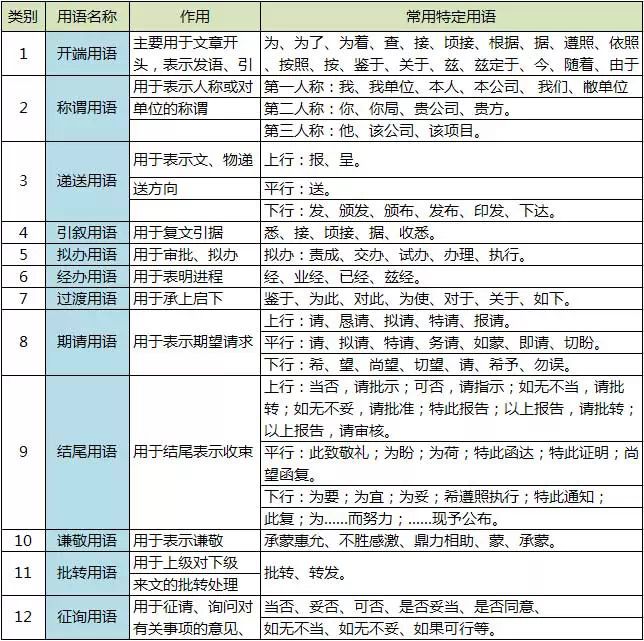 当经,前经,现经,均经,并经;本局,你社,贵公司,贵宾馆;承蒙惠允(承蒙指示、承蒙协助),不胜感激(不胜荣幸、不胜企盼),惠允(惠赠、惠示、惠寄),鼎力支持(大力协助);请,拟请,提请;希,即希,务望(务恳、务请),希予(希将、希能),至希、尚希(尚祈、尚盼),希望,勿误,如蒙,即予;总之,综上各节,综上所述;鉴于上述情,据此,为此,专此;迅即,迅予,从速(火速),在即,当即;责成,查明,知照,下达;会同,上报,报批,拟订;商定,商讨,商洽;比照,引叙来文,重申;擅自,得,不得,酌情处理;颁,颁布,颁行,发布;准予,为荷(盼要);左列(右列、下列、上列),如此,于后,上项,各项,各类,多起,数事,数纸。