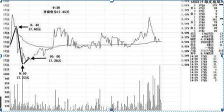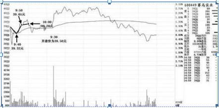 (9)如果9:40、9:50两条线比开盘价低,而另一条线比开盘价高(俗称开盘三线两下一上),则表明空方力量大于多方,而多方也积极反击,底部支撑较为有力,收盘一般为有支撑的探底反弹阴线。