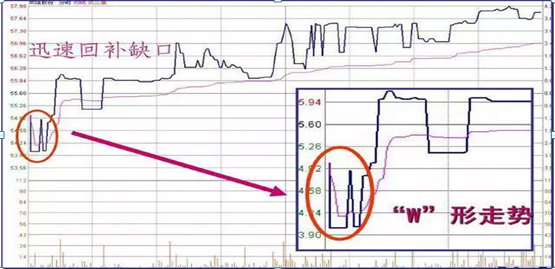 低开股价快速上冲到缺口附近,稍有回落后又快速上攻以回补缺口,分时图上也呈现一个“N”字型或“W”走势—说明低开是为了吓出获利盘和套牢盘,当抛盘被买消化后股价开始回到红盘区,显示多头力道强大,当日看张。