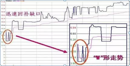 注意:在高开上涨时,关键看股价回探时有没有完全回补缺口。通常情况下强势股是不会回补分时缺口的,从而形成“N”字型走势好和“W”形走势的走势。另外还要结合前几天的K线走势进行参考研判。