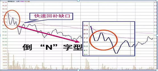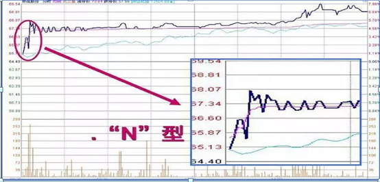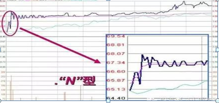 ①“N”型走势:即开盘后股价快速上冲后又快速回落,随机又快速上冲,分时图上呈现一个“N”字型走势—说明开盘后股价遭遇抛压,但随即又被买盘托起,显示多头力道强大,当日看张。