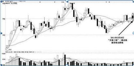 (1)若以9:40、9:50、10:00的三条线与开盘价(9:30)相比,三线都比开盘价高(俗称开盘三线连三上),则表明多头势强,后市向好的可能性很大,收阳线概率大于90%,回档是建仓良机。但如果10:30以前成交量放出天量,则表明庄家或机构有故意拉高或拉高出货之嫌,如出现此情况,应以出货为主。