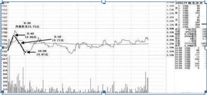 在这个时间段内,若多头为了能顺利地吸到货,开盘后常会迫不及待地抢进,而此时空头为了能顺利地完成派发,也故意拉高股价,就会造成开盘后的急速冲高,这是在大牛市中经常可以看到的现象:若多头为了吸到便宜货,在开盘时会将股价压低,而空头或散户被吓得胆战心惊,不顾一切地抛售完手中的股票,就会造成开盘后的股价急速下跌。