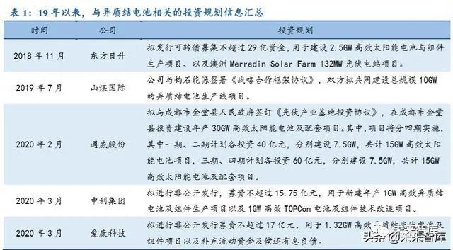 近年来,资本市场对于异质结电池项目的投资热情持续升温。根据 Wind 的统计信息,2019年以来,包括爱康科技、东方日升、通威股份、山煤国际,中利集团在内的多家上市公司陆续发布了与异质结电池相关的投资规划。参考当前单位产能的投资额,我们预计,上述各公司异质结 电池项目的投资规模有望突破 150 亿。