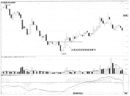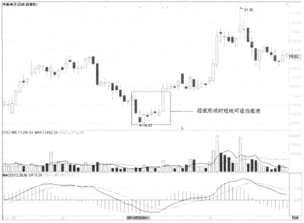 如图3-12所示,中航电子在低位一根长阴线后止跌,然后走出一连串的极短线,股价略有回升,但显然不是买入时机。接着多头强势反击,收出一根长阳线,形成一个塔底。塔底说明多头已经基本扭转走势,进入多头控盘的上升走势中,短线投资者可以在盘中伺机适当介入。该股此后逐浪上升,短线收益不小。