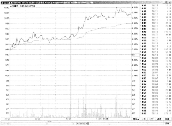我们来看看突破颈线当日的具体走势。如图3-4所示,山东墨龙2012年2月3日略微低开,开盘后震荡走高,很快红盘,进入多头占优的走势。此后该股横盘震荡,但股价一直受到均价线的有力支撑,走势保持良好。午后该股开始爆发,股价放量拉升,最后收出中阳线,多头显然已经占据优势。结合日线看,盘中股价放量拉起,价格突破头肩底颈线的时候,短线投资者可以积极参与。