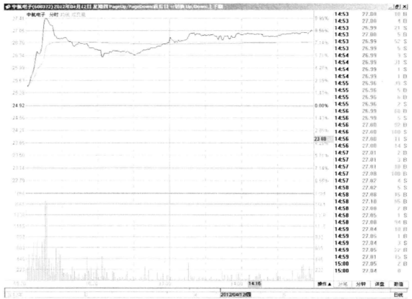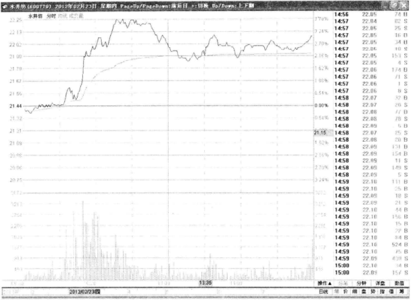 我们来看看这个尖底最后是如何形成的。如图3-6所示,该股在2012年1月10日略微高开,但此后陷入震荡,不过股价线非常平滑,显然有主力控盘,值得密切关注。开盘10分钟后股价跌穿均价线,但很快拉回,同时均价线上移。这是主力短暂洗盘后发动进攻的表现,投资者可以及时跟进。可惜该股此后不久直接拉至涨停,再无跟进机会了。
