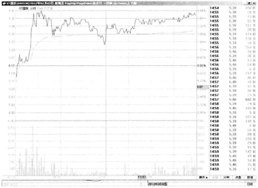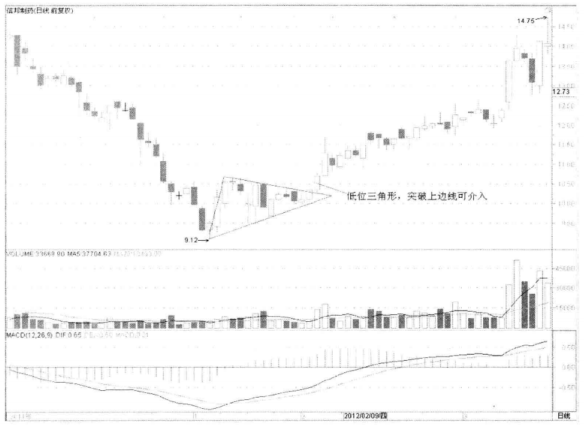 下面我们分析突破当日的分时走势,看看应如何及时捕捉战机。如图3-2所示,该股在2012年2月3日平开低走,不过下跌幅度不大,很快穿越均价线上行,均价线也跟随上行,同步成交量明显放大。一切迹象表明多头开始发动攻势,短线投资者可以积极参与。如果你是稳健的投资者,则可以参照三角形上边线的价格买进,或者等尾盘收高再买进。当日收盘价在全天运行的中高位,且己明确突破三角形的上边线,可放心参与。