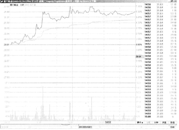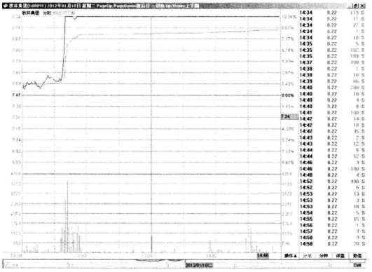 我们来看看突破当日的具体走势,学习在盘中抓进场的时机。如图3-8所示,该股在2012年1月10日平开,然后震荡走高。虽然此后短暂跌穿均价线,但很快拉回。这说明均价线的支撑依然有效。同步均价线明显上移,说明多头的力量在逐步增强,场内买盘越来越踊跃。另外该股涨时放量,跌时缩量,量价配合较好,短线投资者可以逢低买进。