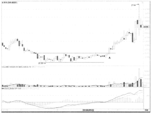 如图3-14所示,水井坊在相对低位横盘震荡,走出一个平行的走势,即箱体。这种平行的走势不好确认性质,可能是底部也可能是下跌的中继平台,需要后市等待多空表态,短线投资者不适合先行潜伏。此后该股中阳线拉起,突破箱体上边线,表明横盘走势已经结束,后市进入上升趋势,是短线进场的良机。此后该股回调,只要没有跌回箱体内部,就说明箱体支撑有效,是加仓的机会。