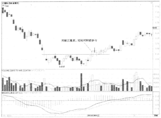 如图3-9所示,ST国发前期大幅下跌,然后横盘震荡,走出三重底。当股价突破三重底的颈线时,短线投资者可积极跟进。该股在突破颈线后没直接拉升,又陷入震荡中,但始终没有跌回颈线之下,说明支撑有效。既然支撑有效,又给了短线投资者加仓的机会,等于送礼。该股此后逐浪上升,短期涨幅可观。