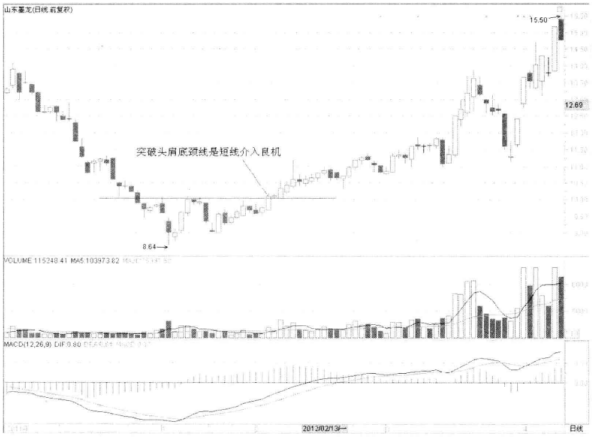 如图3-3所示,山东墨龙前期大幅下跌,然后在相对低位震荡,走出头肩底模样。当然模样是模样,不能确认此就是真正的底部,因此这也不能成为进场的理由。只有股价成功突破头肩底颈线后才是较好的买点,此后如果回踩颈线,支撑有效可进一步加仓。该股后市的走势也正是如此进行,给了短线及时进场的机会。